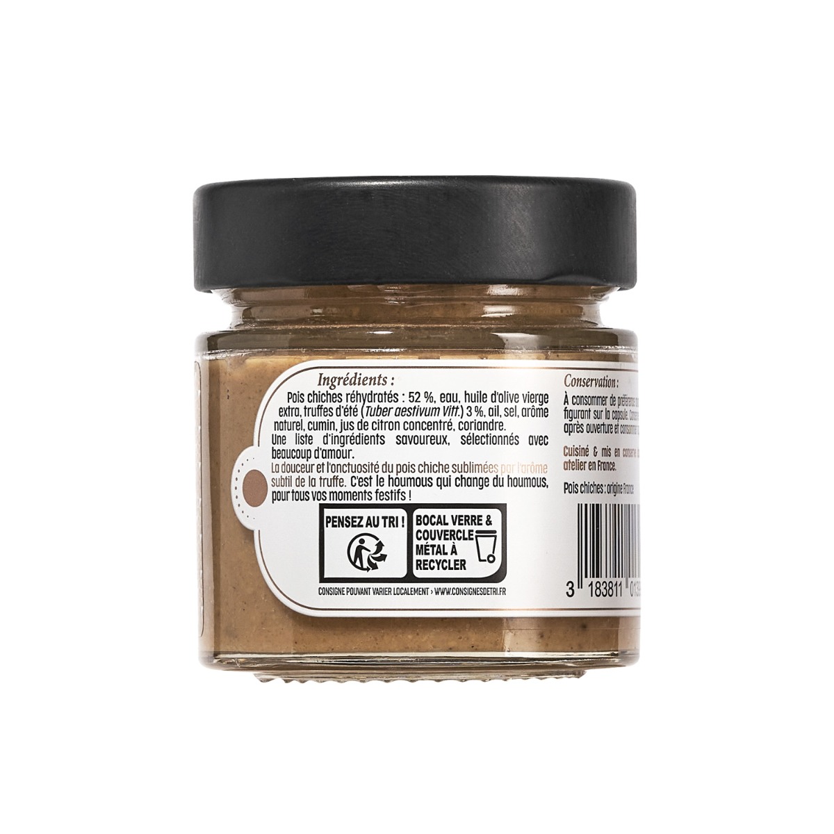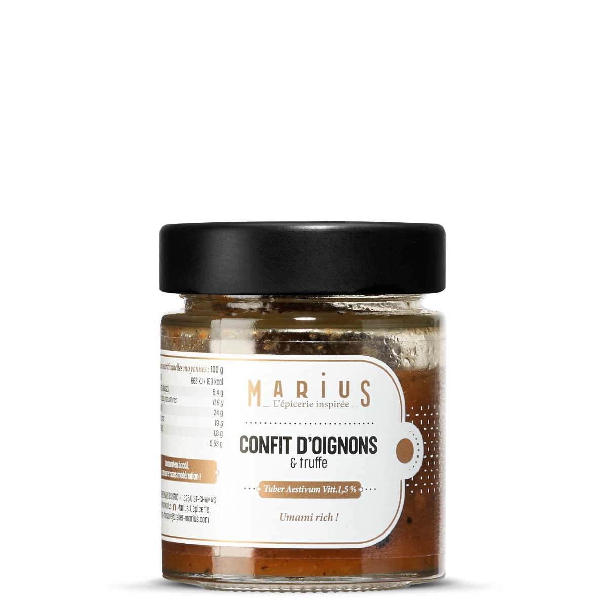 Ingrédients : Oignons de France 61%, eau, sucre, porto, huile de tournesol, vinaigre balsamique de Modène (vinaigre de vin, moût de raisin concentré, moût de raisin cuit, caramel), truffes blanches d’été (Tuber aestivum Vitt.) 1.5%, arome naturel de truffe, sel, jus de citron concentré, poivre.