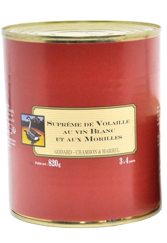 De succulents manchons et filets de Volaille cuisinés dans une sauce “maison” à base de bouillon de canard, de crème, de vin blanc et parfumée aux morilles.